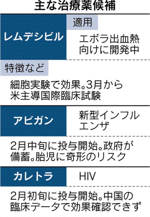 新型コロナウイルスによる肺炎の治療薬について、政府は3種類を中心に患者で試す。米国立衛生研究所(NIH)が主導するエボラ出血熱の未承認薬の国際共同臨床試験(治験)に日本が3月にも参加する。備蓄するインフルエンザ薬なども投与しているが、候補薬の全てで早急に効果を確認するには症例数が少ない。副作用があるため、投与する時期や対象者などの判断基準も求められる。