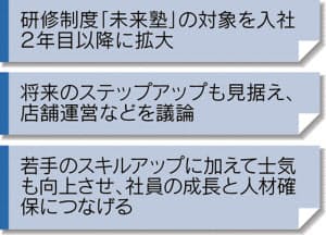 研修制度「未来塾」は2019年に始まった。20年からは当初の副店長に加え、入社2年目以降も対象に加えた。今年は11人が参加する。研修期間は1年間。月1回の座学やグループワークに加え、専用の携帯アプリに仕事での課題などを毎週書き込ませる。他人の内容にも返信させ「自分の課題を具現化することと、他者の行動を評価することで視野を広げる」(人事部担当者)という。