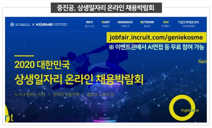 중소벤처기업진흥공단과 지니포럼조직위원회는 다음달(9월) 1일 지니포럼(세계신흥경제네트워크포럼) 연계행사로 '상생일자리 온라인 채용박람회'를 진행한다고 30일 밝혔다. 지니포럼은 지역혁신성장을 위한 글로벌 네트워크 구축을 주제로 지역 스타트업 피칭, 신성장동력 창출방안 등을 논의하는 행사다.