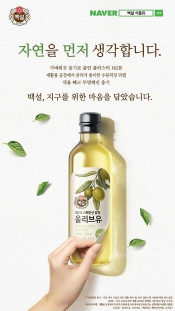 먼저 오프라인 광고는 소중한 당신과 우리들의 지구를 위해 백설이 먼저 시작하겠다는 큰 포부를 드러내고 있다. ‘백설, 자연을 먼저 생각합니다’라는 메인 메시지 아래 ‘플라스틱 사용량을 절감한 용기, 투명한 PET와 재활용 공정에서 쉽게 분리되는 라벨을 사용하여 재활용성을 높인 백설 식용유의 자연과 지구를 위한 새로운 변화’에 대한 메시지를 담았다.