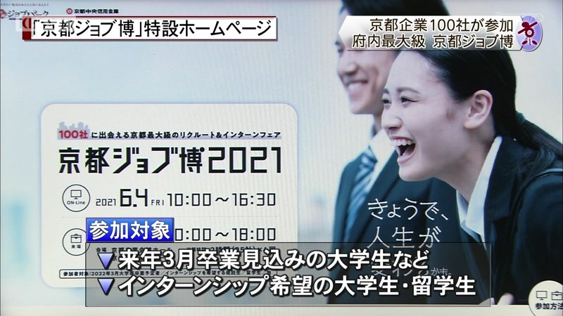 京都府は参加企業が100社という府内最大級の就職フェアを来月おこなうことになり、今、参加する大学生を募集しています。対象は、来年3月大学などを卒業見込みの方と企業のインターンシップを希望する大学生と留学生です。一方、参加する企業は京都府内の100社で民間の人材会社が開催する就職博と比較しても府内最大級の規模となり京都府内の有望企業が名を連ねます。京都府では、感染拡大防止のため参加100社を4つのグループに分け説明会をおこないます。また、学生から要望が多かった企業の採用担当者との個別相談会を学生を2人以内に絞って実施し、学生と企業がじっくりコミュニケーションを取れるようにします。この京都ジョブ博2021は、来月4日はリモートで、来月6日は対面で下京区の京都産業会館ホールで実施し、現在、特設ホームページで参加者を募集しています。実施する京都府はコロナ禍で雇用情勢が厳しさを増す中、学生と有望企業との出会いの機会になればと話しています。
