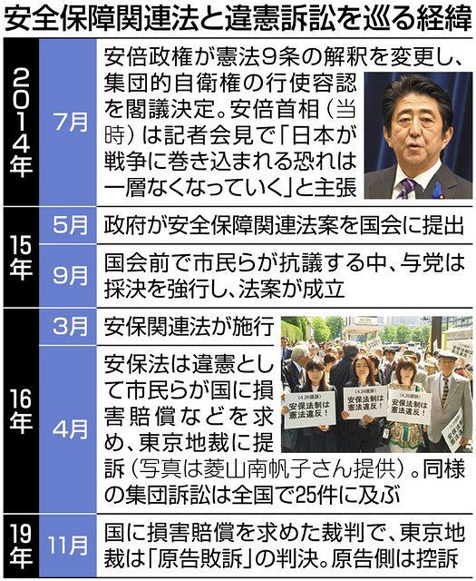 集団訴訟はこれまでに3つの高裁と、16の地裁で判決が出たが、平和的生存権は具体的な権利とはいえないなどとして、いずれも原告の訴えを退けた。安保法が合憲か違憲かの判断は示さなかった。
